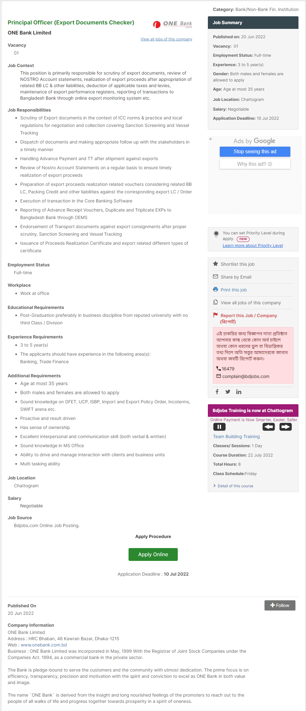 Check All Recent ONE Bank Limited job Circular Posted On BD jobs
